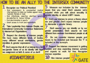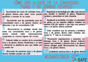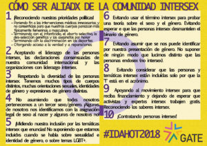 Para el Día Internacional contra la Homofobia y Transfobia (IDAHOT), GATE creó dos recursos, uno sobre “Cómo ser un aliadx de la comunidad intersex” y otro sobre “Cómo ser un aliadx para la comunidad trans y de género diverso. Está disponible en español e inglés, y también creó una versión accesible para aquellos que no pueden leer el gráfico fácilmente.